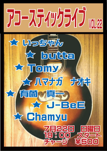 アコースティックライブ22 出演者決定! 7月22日 日曜日 19:00 スタート チャージ ¥500 出演者 ☆ いっちゃん ☆ butta ☆ Tomy ☆ ハマナガ ナオキ ☆ 有薗 真一 ☆ J-BeE ☆ Chamyu