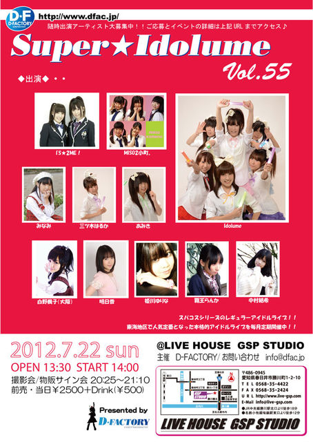 2012年7月22日(日) “Super☆Idolume vol.55” OPEN / 昼13:30〜 START/ 昼14:00〜 撮影・物販 【出演】 I'S★2ME ! Idolume あみき 城奈菜美 白野楓子(大阪) 中村結希← 覇王らんか 姫川ゆりな 三ツ木はるか みなみ (敬称略・発音順) 【会場】 春日井 GSP STUDIO 〒460-0945 愛知県春日井市勝川町1-2-10 TEL:(0568)35-4422 ※JR線勝川駅徒歩25分 ※名鉄味鋺駅徒歩20分 【チケット料金】 前売・当日 \2,500+D(\500) (1drink代\500が別途必要) Produced by D-FACTORY Dire