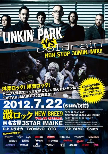 ニュー・アルバム『Living Things』をリリースしたLINKIN PARKとミニ・アルバム『Through CLarity』をリリースしたcoldrain!互いに新作をリリースしたばかりのこの両日米本格派ラウドロック・バンドを激フィーチャーした激ロックパーティーを7/22に名古屋今池で開催決定!! 新作からの曲はもちろん、過去の名曲もガッツリ爆音でセレクトしていきます!! 会場はまるでLP & coldrainのライヴの如くアツい空間、盛り上がりとなること必至!! また洋楽はLIMP BIZKIT、GREENDAY、SLIPKNOT、ADTR、他たくさん。 邦楽はONE OK ROCK、ラスベガス、
