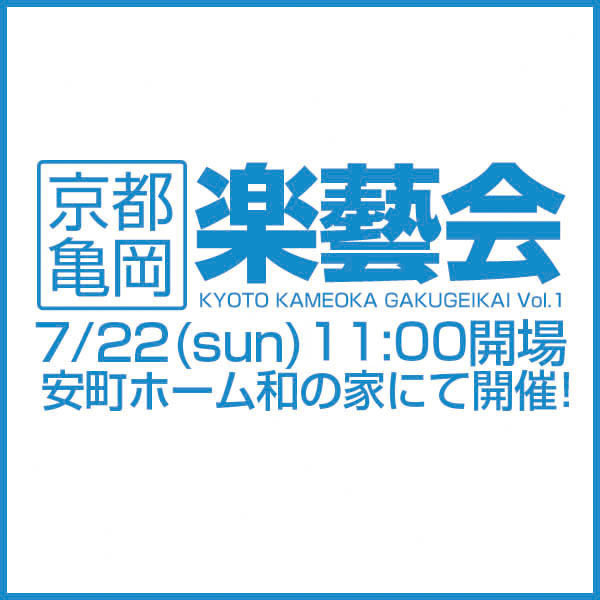 楽藝会と書いてガクゲイカイと読みます。 ノンジャンル毎回テーマを決めて 年に4回開催して参ります。 記念すべき第一回は7月22日日曜日。 場所は亀岡駅から徒歩15分。 亀岡市役所からほど近い 町家の二間続きの畳の間で お昼の部と夜の部に分けて アート・パフォーマンス・ライブを行います。 手にハンコを押したその後は、 出入り自由なので休憩時間に 亀岡を散策ってのもありですね☆ 亀岡のお野菜や特産品を使った 美味しいお料理を用意して お待ちしております。 -------------------------------------