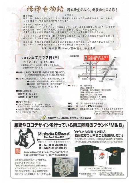 長いご無沙汰をお許し下さい いろいろありましたが やっと、震災後、初となる 公演のお知らせをさせて頂くことが出来ました。 公演としてはなななんと2年ぶりー 岡本綺堂:作 「修禅寺物語」 新歌舞伎の名作と言われてます。 来月、7月22日(日) 卸町の能−BOX(せんだい演劇工房10−BOX別館)で上演します。 開演は12:30と15:00の2回です。 今回、チラシ表面の題字と詩(うた)を作ってくださったのは、 南三陸町でTシャツやトートバッグなどのデザインを手がける 「M&B