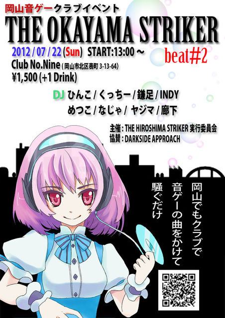 次回の音ゲークラブイベントは岡山となります。 岡山近辺の音ゲーマーの皆様よろしくお願いします!! ********************************************************** 岡山音ゲークラブイベント 「THE OKAYAMA STRIKER beat#2」 ■日時 2012年07月22日(日) START 13:00 ■開催会場 Club No.Nine (岡山県岡山市北区表町3-13-64 ) ■料金 1,500円 (+1ドリンク 500円) ■DJ ひんこ くっちー 鎌足 INDY めつこ ヤジマ なじゃ 廊下 ■VJ それが世界の選択か・・・ ■Twitter h