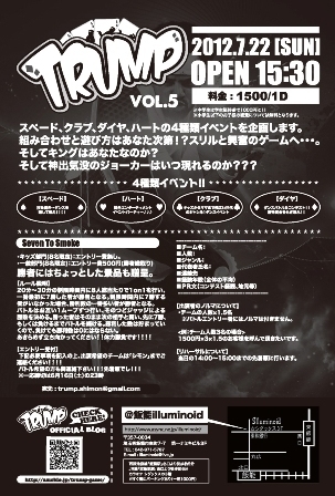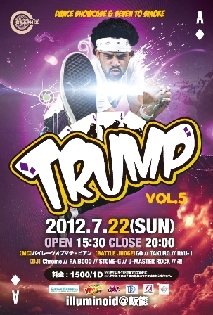 TRUMP vol. 5 TRUMP vol. 5 Dance Showcase & Seven To Smoke ¡ÚÆüÄø¡Û 2012/7/22(Æü) OPEN 15:30 CLOSE 20:00 ¡Ú¾ì½ê¡Û illuminoid@ÈÓǽ ¡ÚMC¡Û ¡¡¥Ñ¥¤¥ì¡¼¥Ä¥ª¥Ö¥Þ¥Á¥ç¥Ó¥¢¥ó ¡ÚBATTLE JUDGE¡Û GO TAKURO RYU-1 ¡ÚDJ¡Û Chrome RAIBOOO STONE-G U-MASTER ROCK Í· ¡ÚÎÁ¶â¡Û 1500/1D ¢¨Ãæ³ØÀ¸¤Ï³ØÀ¸¾Ú»ý»²¤Ç1000±ß¤Ë¡ª¡ª ¢¨¾®³ØÀ¸°Ê²¼¤Î¤ª»ÒÍͤδÑÍ÷¤Ë¤Ä¤¤¤Æ¤Ï̵ÎÁ¤È¤Ê¤ê¤Þ¤¹¡£ ¡ÚSeven To Smoke¡Û ¡¦¥¥Ã¥ºÉôÌç(8̾¸ÂÄê)¡§¥¨¥ó¥È¥ê¡¼Èñ̵¤·¡£ ¡¦°ìÈÌÉôÌç(8̾¸ÂÄê)¡§¥¨¥ó