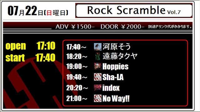 07·î22Æü(Æü)¿·¥Û¥é´ë²è¡ÖRock Scramble¡× OPEN 17:10¡¡START 17:40 ¡ù------------------¡ù 17:40 ¡Á ²Ï¸¶¤½¤¦ 18:20 ¡Á ±óÆ£¥¿¥¯¥ä 19:00 ¡Á Hoppies 19:40 ¡Á Sha-LA 20:20 ¡Á index 21:00 ¡Á No Way!! ¡ù------------------¡ù Á°Çä 1500¡¡ÅöÇä 2000 ¥É¥ê¥ó¥¯ ÊÌ¡¡¥Õ¡¼¥É ÊÌ