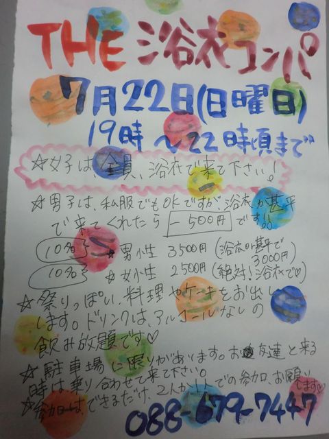 ゆかた、コンパ します! 吉野川フェスティバルや阿波踊り前の7月22日 日曜日 19時から22時頃まで 女子は、絶対、浴衣で来て下さい 男子は、私服でもいいですが、もし 浴衣か甚平で来てくれたら、参加費が500円安くなります 男子 3500円(浴衣か甚平で来店の場合 3000円)10名 女子 2500円10名 祭っぽい、お料理を用意しときます お飲み物は、ソフトドリンクのみになります(アルコールは、別料金になります。) 友達同士複数で参加の場合、友達同士でかたまりやすいので、今
