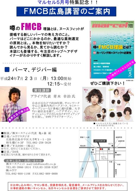 皆様、よろしくお願いいたします。 shinbiyo「マルセル」5月号(4/1発売)に、?ヌースフィットが提唱するパーマ ・ストレートの新しい考え方、「FMCB理論」がかなりのボリュームで特集されました。 これを記念して以下にご案内する講習会を開催いたします。 これまで「FMCB理論」に触れたことがある方もいらっしゃいますが、これまでに 無い考え方なもので、多くのご質問を受けておりました。 そこに今回の取材要請があり、良い機会でありましたので詳細について誌面で 解説することになりましたが、さらに身近でFMCB理論を確認