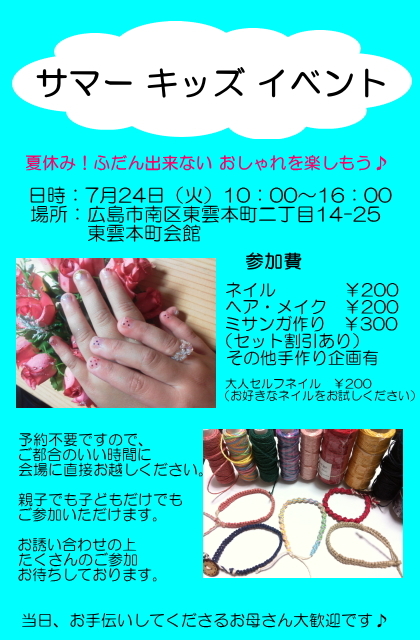 夏休み!ふだん出来ないおしゃれを楽しもう♪ 子どもを対象にイベントを行います。 参加費(材料費・施設費) ネイル200円 ヘア・メイク200円 ミサンガ作り300円 (セット割引有) その他手作り企画考え中です。 予約は不要ですので、ご都合のいい時間に会場に直接お越しください。 親子でも子どもだけでもご参加いただけます。 たくさんの子ども達と楽しい時間を共有出来たらなと思っています。 当日、お手伝いしてくださる方も大歓迎です♪ お誘い合わせの上、たくさんのご参加お待ちしております。 企画:salondu.