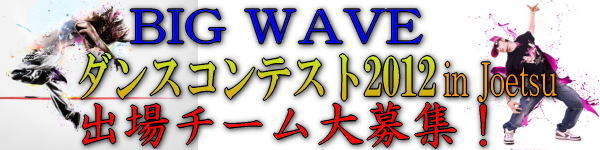 BIGWAVEダンスコンテスト2012in Joetsu 出演者大募集です! 新潟県上越市で開催されるダンスコンテスト! 今年で6回目のコンテストが開催決定いたしました。 それに伴いまして出場チーム大募集中です。 是非コンテストにチャレンジしてみてください! 以下詳細です⇒ 日程 2012年 7月25日(木) 受付 14時〜14時30分 場所 上越市本町通り雁木通りプラザ前 (新潟県上越市本町3丁目2-26) 本番 時間 15:30〜18:00 人数 2名以上のダンスチーム (決勝の舞台が横10m縦5mですので、その中に収まる人数でお願いします)