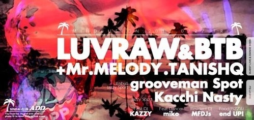 GUEST LIVE:LUVRAW & BTB(Pan〓Pacific〓Playa) GUEST DJ:Kacchi Nasty(jazzy sport) grooveman Spot(Enbull/Tettory Bad/Tettory BLK/azzy Sport) GUEST DANCE SHOW:Tanishq RESIDENT DJ:BLACKPOT (BREATHPOD) Captain Boogie Monkey sequence.19 A-RAG-RSOUL(MAILMAN) FOOD:end UP! OPEN 22:00 前売りチケット 2,000YEN/1D ADD MEMBER2,000YEN DOOR 2,500YEN Mind Fusion 2006年1月、仙台のclub ADDを舞台にスタートしたクラブ・パーティー。 オープンな音楽性で、HIPHOP、SOUL、FUNK、BOOGIE、BEATDOWN、HOUSEと新旧
