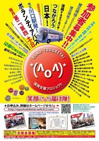 笑顔(^o^)届け隊! 第31陣 埼玉県川口市発、被災地へのボランティアバスパックです。 随時参加者募集中です! どんな些細なことでも構いません。 現地に足を運んで、復興支援をしてみませんか? 「微力」は決して「無力」でありません。 過去の参加者も10代〜70代まで幅広く、 どのような方でも必ず被災者の皆様に 笑顔を届けることができました。 皆様のご参加を、ぜひお待ちしております。 【スケジュール&活動内容】 7月27日(金)23時30分、JR川口駅西口リリア前集合 7月28日(土) 活動場所:湊町松巌寺 流しそ