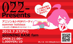 022−Presents アニソン&J-POPパーティ summer holidays 〜大人だって夏休みスペシャル!!〜 2012.7.27(FRI) @DINING BASE fam OPEN:21:00〜 1,000YEN(1D) コスプレ、前売り、当日全て一緒の料金です。 *20歳未満のご入場はご遠慮頂きます。 DJ BunnyLack beans ケン坊 コゼット akkiy まりぼう(POP TUNE/scoool!!!) melon ubiquitous (Dimension's Gate/Rim shoot) suzxi(022-/scoool!!!) ikumin(022-) singer えりかてん(colorAgeband) (株)超銀河系ユニット(022-) 佐倉(022-)