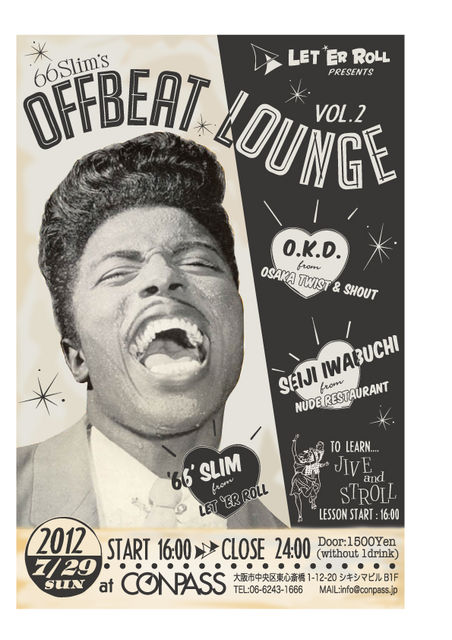 "OFFBEAT" 型にはまらない/自由な/不規則な "LOUNGE" 寛げるスペース/ゆったりする場所/休憩室 自分達にとって"型にはまらない自由でまったり出来る空間"もっと簡単に言うと「何でもええねん!」そんなニュアンスの意味を持った言葉をカタチにしたLIVE/DJイベントです。 小粋で洒脱にSWINGするHOT JAZZ ヨーロッパのクラブシーンでも今現在大きな盛り上がりを見せているNORTHERN SOUL、CROSS OVER R&B ラフでタフなROCKIN' BLUESにJUMP BLUES、ジワジワと人気再燃の兆しのあるREAL ROCK'N'ROLL/ROCKABILLYやEXOTICでDIRTYでWEIRDなTITTY