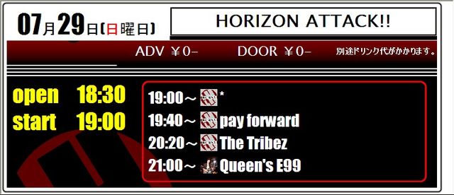 07月29日(日)新ホラ企画「HORIZON ATTACK!!」 オールジャンルな一日 OPEN 18:30 START 19:00 ☆------------------☆ 19:10 〜 * 19:50 〜 pay forward 20:30 〜 The Tribez 21:00 〜 Queen's E99 ☆------------------☆ 前売 0 当売 0 ドリンク 別 フード 別