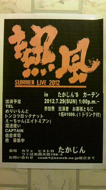 2012.7.29(日)15:00-21:00 悪天中止 入場料:2,000円(高校生以下無料)