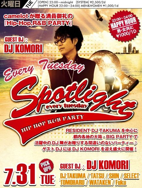 管理人様、告知失礼致しますm(__)m 7/31(tue) Spotlight@camelot OPEN 22時00分 camelotが贈る満員御礼の『Hip-Hop,R&B PARTY』 RESIDENT DJ Takumaを中心に都内各所の大箱・BIG PARTYで活躍するDJ達が、 最新のビルボードHITから懐かしの名曲を網羅。FOODブースもヘアブース等も完備。 いつきても楽しめる間違いないPARTY。 SYSTEM ¥2500/2d HAPPY HOUR 22:00〜0:00(MEN&WOMEN ¥1000/1d) GUEST DJ KOMORI RESIDENT DJ TAKUMA DJ TATSU SHIN SELECT TOMOHARU WATAKEN BULL c.w.g SUPPORTED by KENSHI