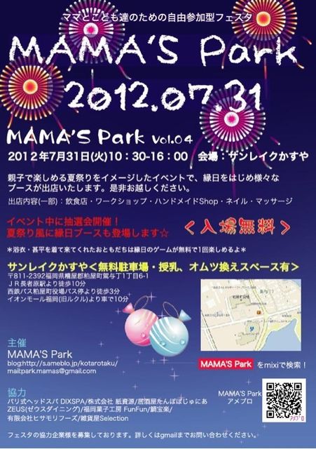 いよいよやってきました 第4回 MAMA'S Parkフェスタ ☆2012.7.31(火)☆ 10:30〜16:00 会場 サンレイクかすや(多目的ホール・和室・駐車場の一部) 〒811-2392福岡県糟屋郡粕屋町駕与丁1-6-1 JR長者原駅より徒歩10分 西鉄バス粕屋町役場バス停より徒歩3分 イオンモール福岡より車で10分 入場はもちろん無料 無料駐車場、授乳、オムツ換えスペース有り コミュ会員様はもちろんどなたでもご参加いただけます!! 夏祭りをイメージしたヨーヨーや、くじ引きなどの縁日ブースを始め、かき氷、ホットド