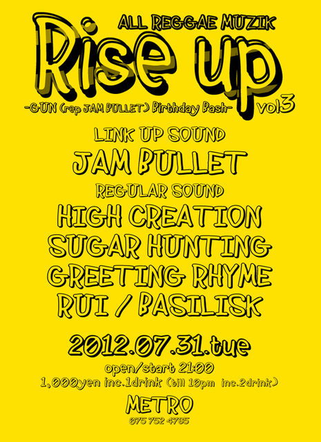 Rise up vol3 GUN (rep JAM BULLET) Birthday Bash @METRO 7/31 (火) start 21:00~ 1000yen-1d (22:00まで1000yen-2d ) LINK UP SOUND : JAM BULLET SOUND : HIGH CREATION / SUGAR HUNTING / GREETING RHYME / RUI / BASILISK 2ヶ月に1回のREGGAE EVENT [Rise Up] 今回は京都で活躍し続けるSOUND JAM BULLET のMC「GUN」のBirthday Bash ということで、Rise Up Crewと京都のREGGAE好きの皆さんとMETROスタッフで盛大にお祝いしたいと思って おります!! 回数を重ねる毎にいい感じになってきているRise Up是非一度