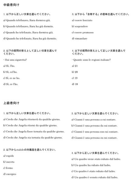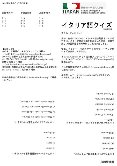 皆さん、こんにちは! 京都にあるITAKANは、イタリア語を勉強されている方々に、イタリア語の知識を忘れないために、簡単で楽しい練習問題を毎月無料でご案内いたします。 電車、タクシー、バスの中やご自宅で、イタリア語 クイズをお楽しみ下さい。 またITAKANはイタリア語の個人レッスンやグループレッスンも行っており、ITAGO.TV(http://www.itago.tv/)を使用します。 もしご質問等がごさいましたらitakan@itakan.orgにご連絡下さい。 是非ホームページ(http://www.itakan.org/)もご覧下さい。 お待ちしております!