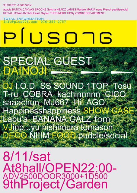 管理人様告知失礼します。 "チケットほしい方メッセージお気軽にください" 昨年650人を動員した1年に1回のBIGPARTY+076今年も開催決定!! もちろん今年もオールジャンルで誰でも参加できるEVENTです! ゲスト→ダイノジ(大地洋輔、大谷ノブ彦) あの大地の世界一エアーギターを披露!! 詳しくは以下詳細をご覧ください。 -主催- +076(プラスゼロななろく) -協賛 協力- Clubism(クラビズム) ソフトバンク金沢県庁前店 -ALL GENRE MUSIC PARTY- 2012/08/11(SAT) +076 9th PROJECT-Garden- at KAN
