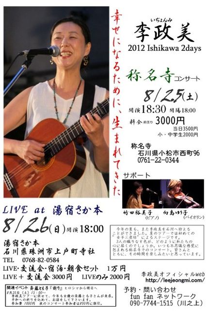 8/25(土) 斉藤とも子『祈り』 ヒロシマから明日へ  12:30開場 13:00開演  場所 称名寺 (コバヤシスタジオ前)  石川県小松市西町96  TEL:0761-22-0344  参加費 1000円  (夜の李政美コンサート参加者は800円)  中学生以下は無料です。 申し込み  称名寺・小松市西町96  TEL:0761-22-0344  川之上佐代子(090-7744-1515)  女優の斉藤とも子さんが、今年もスケジュールを調整し、このツアーに参加して下さることになりました。今年で3回目となります。  とも子さんは毎年8月6日、広島へ行かれています。昨年、広島