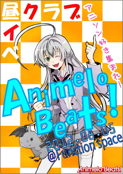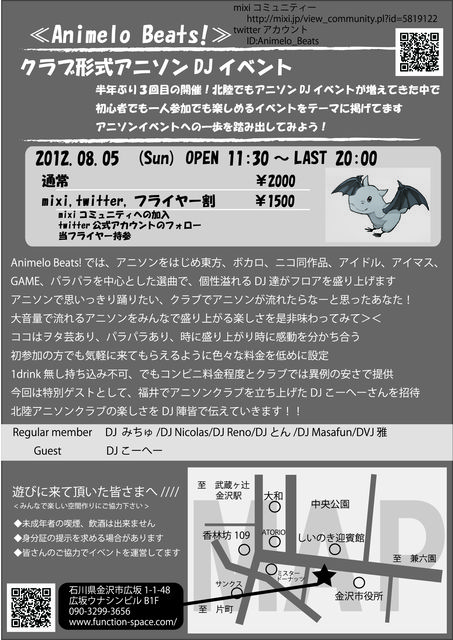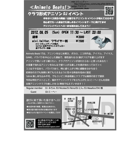 Animelo Beats! vol.3 (ふっかーっつ!夏だ!暑いぞ!ココはもっと熱い!) 初参加大歓迎、みんなで作るみんなのイベントAnimelo Beats! 金沢の真ん中で爆音アニソンたいぃぃぃぃむ!! 日時:2012年8月5日 11時半OPEN 12時START 19時CLOSE→20時完全解散 会場:Function Space 料金:フライヤー・mixi・twitter割引、1500円     一般入場、2000円     コスプレサービス 希望があれば…テキーラ1ショット 当コミュニティーに参加し、TOPをご提示いただければ割引になります。 又はtwitterで