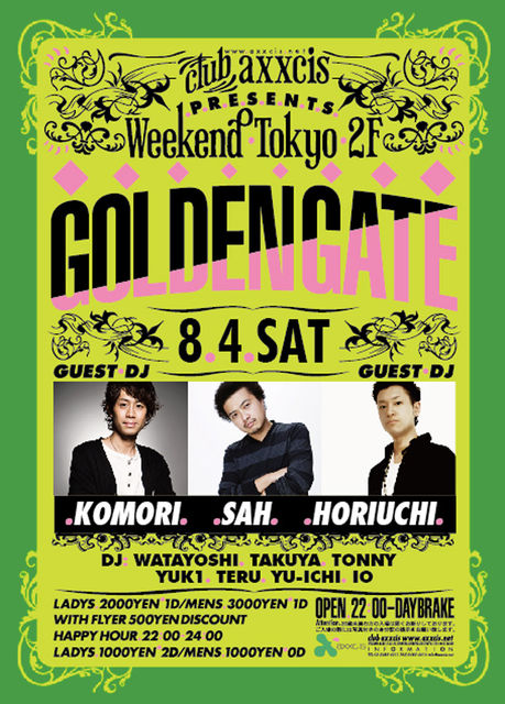 8/4(SAT)GOLDEN GATE@axxcis ★★★★★ エントランスにて「ユキのゲストでアクシス」とお伝え頂ければ、何名様でもゲスト料金にてご入場頂けます! お気軽にご利用ください!! ★★★★★ ☆☆☆☆☆ または、メッセージ頂ければ個別のゲストもお取り致します! 代表者名とだいたいの人数を直接メッセージください! 折り返しメッセージ致します!! ☆☆☆☆☆ ※ゲスト料金※ 24時までに入場→男性1000円/0D、女性1000円/2D 24時以降に入場→男女共1500円/1D ■2012/08/04(sat.) WEEKEND TOKYO@渋谷AXXCI