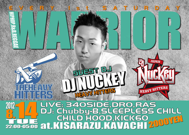 毎月第1土曜日に木更津でBIG PARTY開催中です 今回は特別編として、木更津のお祭り『やっさいもっさい』の夜に『WARRIOR』開催です。 GUEST DJには世界最強DJ集団“THE HEAVY HITTERS”の正式メンバーとなったDJ NUCKEYが、 木更津に来てプレイするという信じられないような話。しかし、 8/14(火)はDJ NUCKEYが木更津の夜を盛り上げてくれるんです。 地元木更津からは人気の高いラッパー340SIDEとRASが参戦 DJやラッパーも千葉県の各方面から参戦 都内や他県からは、SEXY G