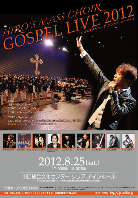 HIRO's MASS CHOIRが また今年も暑〜い時期の 熱〜いライブを開催します! 年に一度、2000席のホールで行われるビックコンサートです。 今年のスペシャルゲストは、なんとアメリカの有名ソウルバンド MAZE(メイズ)のキーボーディスト、フィリップウー氏が 素晴らしいバンドの一員として、私達の歌声をサポートして下さいます!! HIRO's MASS CHOIR GOSPEL LIVE 2012 2012年8月25日(土) 出演: 木村 ’HIRO’ 洋幸 HIRO's MASS CHOIR HIRO's Dance Team Key/ Gakushi Key/ 石田まり Bass/ 滝元堅志 Guit