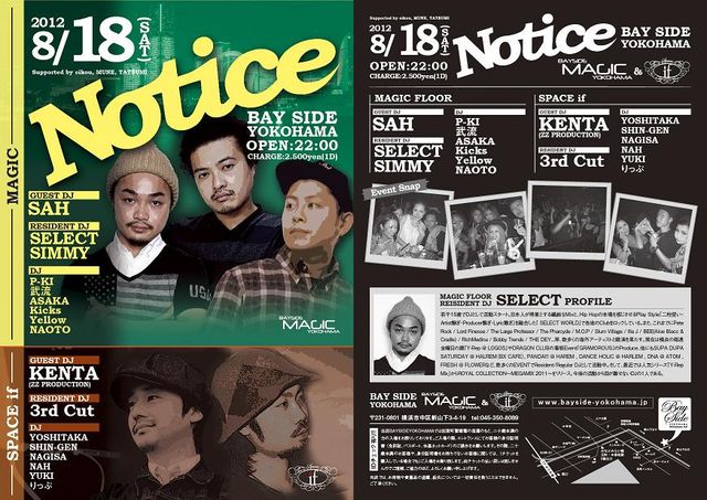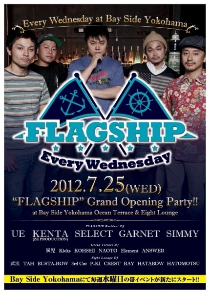 現在の横浜CLUBシーンを牽引しているDJ UE & DJ KENTAのコンビネーションも4年ぶりに復活し、現在横浜や東京で頭角をメキメキと現してきているDJ SELECT, DJ GARNET, DJ SIMMYの3人を加えたレジデントDJs、そして今後の活躍が期待される若手DJ達とが支える"FLAGSHIP"は、7/25のオープニングを皮切りになんと!!8月中は夏限定特別企画でOCEAN TERRACEとEIGHT LO