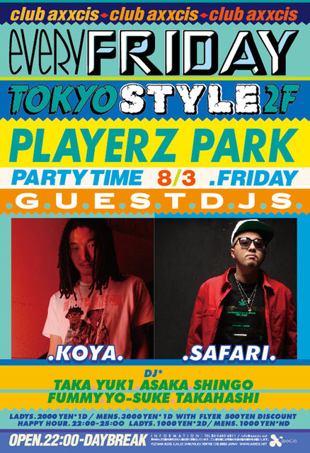 8/3(金)PLAYERZ PARK @club axxcis ★★★★★ エントランスにて「ユキのゲストでアクシス」とお伝え頂ければ、何名様でもゲスト料金にてご入場頂けます! お気軽にご利用ください!! ★★★★★ ☆☆☆☆☆ または、メッセージ頂ければ個別のゲストもお取り致します! 代表者名とだいたいの人数を直接メッセージください! 折り返しメッセージ致します!! ☆☆☆☆☆ ※ゲスト料金※ 1時までに入場→男性1000円/0D、女性1000円/2D 1時以降に入場→男女共1500円/1D 8/3(FRI)『PLAYERZ PARK』@axxcis OP