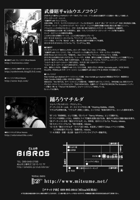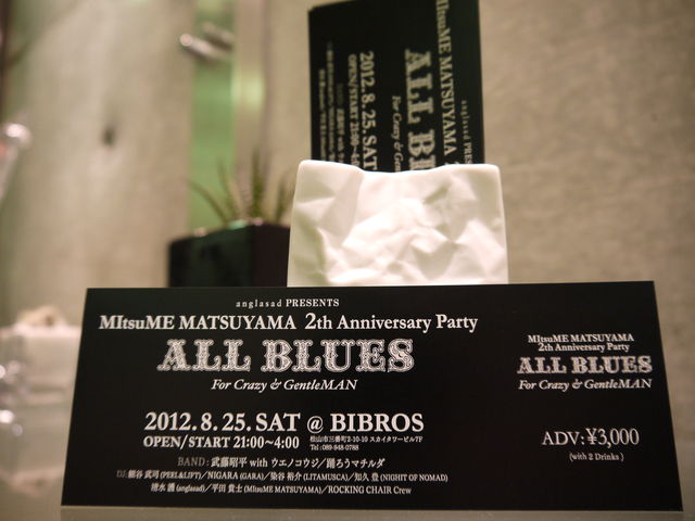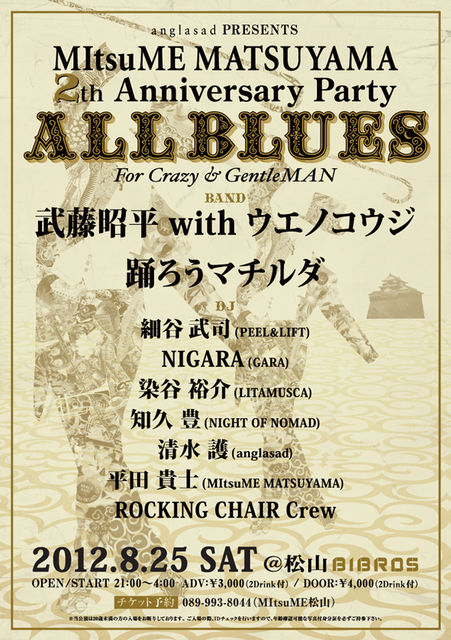 管理人様、急な告知失礼致します。 MItsuME MATSUYAMA 2th Anniversary Party 〜ALL BLUES〜 2012.8.25 (SAT) @BIBROS 愛媛県松山市三番町2-10-10 スカイタワービル7F. Tel: 089-948-0788 OPEN/START 21:00 〜 4:00 ADV:¥3,000(2Drink付) / DOOR:¥4,000(2Drink付) 【LIVE】 武藤昭平 with ウエノコウジ 踊ろうマチルダ 【DJ】 細谷 武司 (PEEL&LIFT) NIGARA (GARA) 染谷 裕介 (LITAMUSCA) 知久 豊 (NIGHIT OF NOMAD) 清水 護 (anglasad) 平田 貴士 (MItsuME MATSUYAMA) ROCKING CHAIR Crew 【チケット予約】 089-