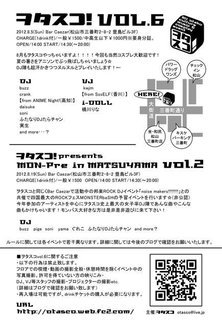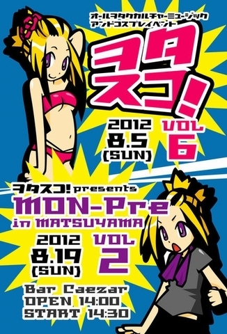 管理人でおます。 昨年も関西と愛媛の松山で「MON-Pre」を 開催しましたが、今年も松山は決定しました。 昨年のvol.1はsoni、pige、まーぼの3人で行いましたが、 今年は松山市内でアニソン系イベントを行っている 『ヲタスコ』http://otasco.blog.fc2.com/ のDJ陣と、邦楽ロックDJイベント 「noise makers!!!!!!!!!」http://noisemakers.jugem.jp/ そして、去年のMon-Preにも参加してくれ、 新居浜での「ぶら☆きもい」でもDJとして参加している まーぼ君も参加してくれます☆ お時間のある方は是非遊びに来てくださいー!(・∀・)