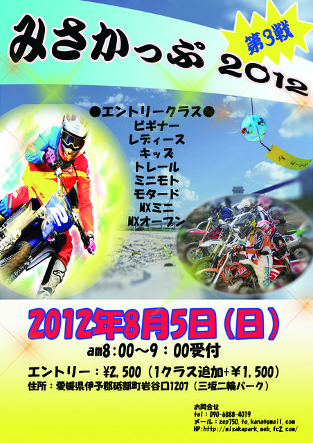 こんにちは(・∀・) 早くも第3戦となるみさかっぷ2012の開催が8月5日(日)に決定致しました 年間4戦のもう3戦目ですよ!・・・と言う事で早めに告知してみました。 以下レース要項(いつも通りですが。) ●エントリークラス● ・ビギナー ・レディース ・トレール ・モタード ・キッズ ・ミニモト50 ・ミニモトオープン ・MXミニ ・MXオープン ●受付時間● 当日朝8:00〜9:00 ●エントリー費● 1クラス¥2,500 (1クラス追加毎に1,500円) ●注意事項● ・ヘルメット・グローブ・ブーツは必ず着用して