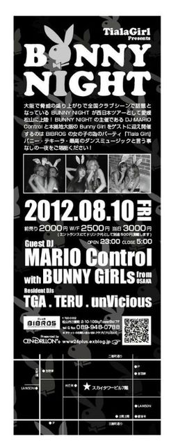 -BUNNY★NIGHT TOUR 2012- MATSUYAMA STAGE/TialaGirl presents! 2012.08.10.FRI @CLUB BIBROS START/22:00- :GUEST: MARIO+CONTROL aka MAR+CTRL ☆BUNNY GIRL ☆Tequila GIRL :DJ: TGA. TERU. unVicious http://iflyer.tv/search/BUNNY★NIGHT http://iflyer.tv/partyreport/108257/BUNNYNIGHT-feat.-CASINO-TOUR-2012/ http://iflyer.tv/mario-control/ ========================================================= DOOR/ 3,000円|ADV/ 2,000円|with/FLYER/ 2,500円 □プレイガイドチケット□