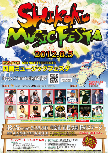 【四国ミュージックフェスタ2012】 日時:2012.8.5(SUN) OPEN 11:00/CLOSE 17:00 場所:愛媛県今治市 市民の森 野外ステージ チケット:前売り2900円(+1drink order\300) ローソンチケット:Lコード 61443 問い合わせ先TEL 0570-084-006 WEB http://l-tike.com/ 当日3900円(+1drink order\300) 保護者同伴に限り小学生以下は入場無料 問い合わせ先:midnight_presents@yahoo.co.jp [ARITIST] NG HEAD,MATTON,たなけん,APOLLO,FUZEE,DEMPSYROWL,YSK,M2,BURIBONG,カタルシス,REASONABLE [SOUND] BARRIER FREE,BREAK JAM,UNI