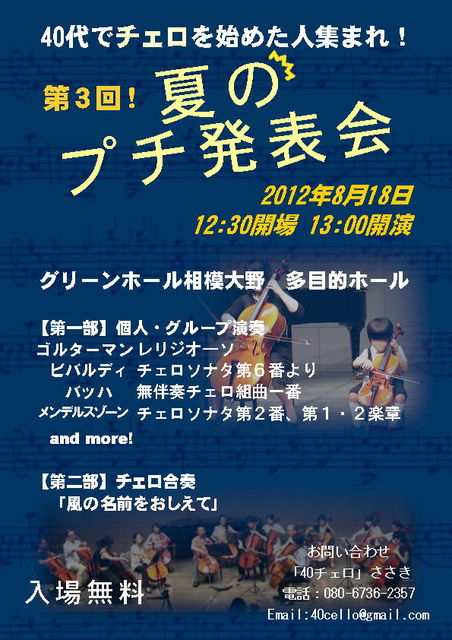 ★更新情報 7/14:開始時間を30分遅らせました。 7/23:ピアノ合わせの専用会議室が出来ました。 第3回! 夏のプチ発表会の公式情報(予定)をまとめて掲載致します。 また同時に参加申し込みの受け付けもしております。 チェロを始めて間もない方、教室での発表会はちょっと、、、という方、コミュの仲間内で気楽に弾いてみませんか? また、簡単な合奏も予定していますので皆さん奮ってご参加下さい。 ・基本情報 開催日時は、8月18日(土)、開演13時30分、開場は13時丁度の予定です。 会場は朝9時から使用可能ですが、照明など