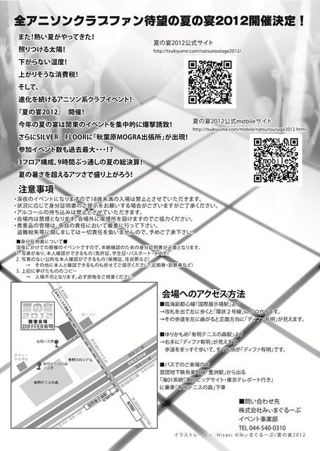 また!熱い夏がやってきた! 照りつける太陽! 下がらない湿度! 上がりそうな消費税! そして、 進化を続けるアニソン系クラブイベント! 『夏の宴2012』 開催! 今年の夏の宴は関東のイベントを集中的に爆撃誘致! さらにSILVER FLOORに「秋葉原MOGRA出張所」が出現! 3フロア構成、9時間ぶっ通しの夏の総決算! 夏の暑さを超えるアツさで盛り上がろう! ■イベント概要 ・開催日時 2012年8月9日(木) 開場時間 21:30 開演時間:22:00 ・料金 男性:¥3,000 女性:¥2,500 ・開催場所 ディファ有明