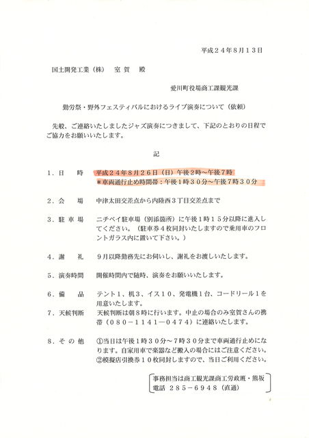 今年もやってまいりましたー(^O^ 詳細はまあいつもとおんなじ感じですー。 【以下詳細追記】 私の働く職場の近く【神奈川の田舎です】でお祭りがあります。 そのお祭りにいろんな出店があります。 焼きそば、ビール等。 そこに、セッションという出店をします(笑 屋外で、お客さんが気持ちよく聞いてくれたらいいなって思っております。 すんごい遠い場所ですが・・・・w ぜひぜひご参加ください。 開催事業名:愛川町勤労祭 開催日:2012年8月26日(日)「雨天延期無し、小雨決行」 時間:午後2〜7時ごろ