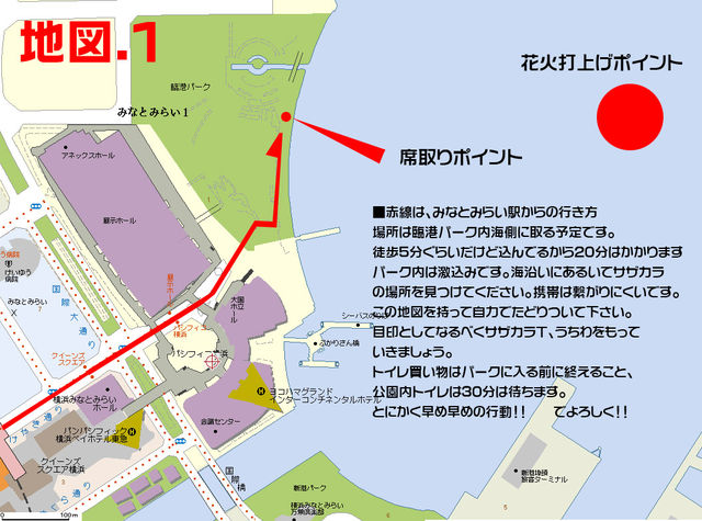 昨年のMM横浜花火は盛り上がりましたね!! 今年も・・・ もちろんMM横浜花火をみんなで楽しみましょう!! 花火鑑賞ポイントは昨年同様に大桟橋と象の鼻のつけねの芝生ポイントです 神奈川新聞花火大会への参加概要は下記の通りです!! 〔2012神奈川新聞花火大会参加概要〕 ■開催日時 2012年8月1日(水) 19時15分〜20時30分 ■打上げ場所 横浜・みなとみらい(MM21地区) 臨港パーク前面海上 ■集合待合せ 大桟橋&象の鼻パークのつけねの芝生ブルーシート ■集合時間 2012年8月1日(水) 18時頃から ■持寄り