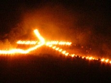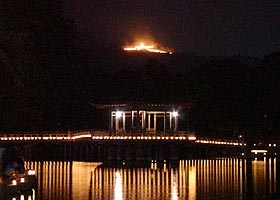 高円山 奈良大文字送り火 8月15日(水)20時点灯 18:50 慰霊祭(飛火野) 20:00〜20:30 演奏会 高円山の山脈に『大』の字の送り火をして、諸霊を慰めるため、昭和35年から始められた『奈良大文字送り火』。 『大』の字は、宇宙を意味し、人体にひそむ煩悩の焼却と、諸霊に供養する清浄な心を表します。 字の大きさは、一が109m ノの部分が164mで 日本一の規模。 奈良公園飛火野では18時50分から、大文字慰霊祭が行われます。神式と仏式が行われる珍しい慰霊祭です。 20時に点灯され、火はみるみ