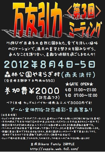 第3回 万友引力ミーティング 万友引力MTG 3th(ばんゆういんりょく) 日程:8月4日(土)〜5日(日) 場所:〒638-0026 奈良県吉野郡下市町西山550 下市町森林公園やすらぎ村 0747-58-0114 ||||||||||||||||||||||||||||||||||||||||||||||||||||||||||||||||||||||| ■開催日程:2012年8月4日(土)〜8月5日(日)雨天決行 ■受付時間:4日(11:00〜21:00)5日(7:00〜12:00) ■参加費:2,000円 ペア(夫婦・カップル)バイカー特典あり 日本の夏!万友引力の夏!