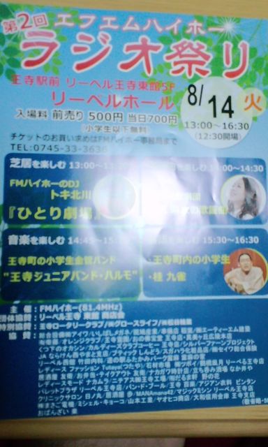 FMハイホーのイベントです! 地元FM曲のイベントなのでいろんなゲスト出演もあります(^∀^)ノ ナモはゲスト出演する北沢麻衣さんのお手伝いで参加します 当日入場料700円ですが…「北沢麻衣さんを観に来ました」と言っていただけたら500円になります。 当日出演者:トキ北川・北沢麻衣・桂九雀等… 主催:FMハイホー(81、4MHz)…0745333636 入場料:前売り500円 当日700円 (小学生以下無料)