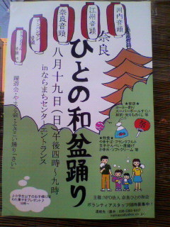 奈良ひとの和 盆踊り 開催日 2012年8月19日16:00〜21:00 開催場所 ならまちセンターエントランス http://www17.ocn.ne.jp/~naramcnt/ 猿沢池の南側 河内音頭、 江州音頭、奈良音頭、アンパンマン音頭、ドラえもん音頭 など 盆踊りが行われます。 奈良躍遊会 やまと会 よさこい踊り「さい」 奈良躍遊会 http://web1.kcn.jp/narayakuyuukai/ 大人からこどもまで 楽しめます。 ★夜店 ヨーヨー釣り、スーパーボールすくい、射的、光りものくじ等 ★飲食 やきそば、フランクフルト、玉子せんべい、唐揚げ、かき氷
