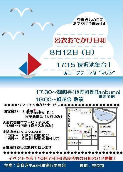 奈良、夏の風物詩『燈花会』へ浴衣でお出かけしませんか? ■日程 2012年8月12日(日) ■集合 17:15 猿沢池(南西側)集合! ■テーマ マリンコーデ! <<スケジュール>> 17:15 猿沢池集合、写真撮影 17:30 懇親会(イタリア料理Bambunoにて)※要予約 19:00 燈花会散策 http://www.toukae.jp/index.html <<懇親会について>> 場所:イタリア料理Bambuno http://bambuno.eek.jp/ 会費:3,500円(お食事+1ドリンク) 定員:20名様 ご自分で浴衣を着れない方の為に・・・ ■■同日開催■ワンコインサービス!■■