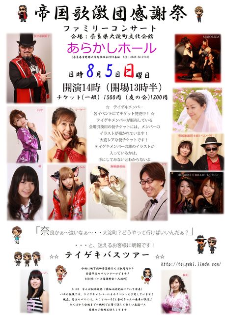 帝国歌激団の感謝祭、ファミリーツアーまで1週間を切りました。 公式HPやフライヤーにて告知しておりましたが、バスの出発時間・集合場所が決まりましたので告知致します。 集合日時 8/5 日曜日 11時00分(出発11時30分) 場所:大阪市浪速区元町1丁目5−30 難波元町小学校前 地下鉄四つ橋線なんば駅32番出口 です! 往復バス代&チケット代でこのお値段!。まさに感謝祭wな4000円ポッキリ!。 往路はみことねっち、春妃、あいりん*がツアーガイドとして同乗。 復路は他のメンバーも分かれて同乗します!。 皆様、お誘い