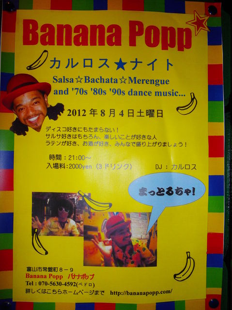 お待たせしました!8月のパーティーは・・・・ カルロスナイトです! サルサ・バチャータ・メレンゲ、毎度おなじみDJカルロスが今回はディスコ好きにもたまらない’70s〜’90sdance music も織り交ぜ、暑い夜を盛り上げます!!! サルサ好きはもちろん、楽しいことが好きな人、お酒が好きな人、みんな盛り上がりましょう! 時間 : 21:00〜 入場料 : 2000円(3ドリンク) ★泥酔の方の入場はお断りします。 ★飲食物の持ち込み禁止 ★近隣の迷惑になりますので出入りの際、大声で騒いだりしないようお願い