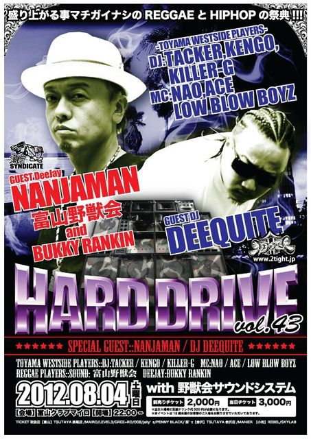 2012.8.04 (sat)@MAIRO富山野獣会&T.W.C PRESENTS… HARD DRIVE vol.43 OPEN / 22:00 〜mid…ADV \2.000 Door \3.000(当日入場時に別途ドリンク代\500が必要になります。) SPECIAL GUESTNANJAMAN(爆音SYNDICATE)DJ DEEQUITE(II TIGHT LLC) REGGAE PLAYERS富山野獣会 & BUKKY RANKIN(大阪) WESTSIDE PLAYERSDJ: TACKER / KENGO / KILLER-GMC: NAO / ACE / LOW BLOW BOYZ 盛り上がる事マチガイナシのREGGAEとHIP HOPの祭典! 富山REGGAEを代表する「野獣会」& 富山WESTSIDEを代表する「T.W.C」がタッグを組み、この夏に贈るBIGG