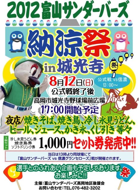 ■8月12日(日) BCリーグ・富山サンダーバーズ納涼祭 場所:高岡市・城光寺球場・特設ステージ 時間:16:45 山本 剛 ソロライブ ☆島かおりさん、 ゴメス★河田さんとのコラボレーションもあるかも??です!
