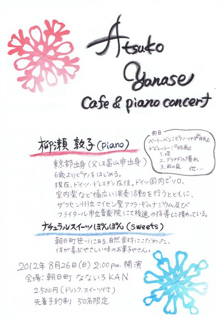 ドイツで活躍されているピアニストさんと朝日町のスイーツ店なちゅらるスイーツぽんぽんさんコラボのカフェ&ピアノコンサートの企画スタッフをすることになりました。 自然豊かなゆったりとした環境の中でピアノの音楽とカフェ&スイーツのひと時を楽しみませんか? 柳瀬敦子(piano) 東京都出身(父は富山県出身) 6歳よりピアノを始める 現在 ドイツ・ドレスデン在住 ドイツ国内でソロ室内楽など幅広い活動を行うとともに後進の指導に携わっている ナチュラルスイーツぽんぽん 朝日町笹川にある自然食材にこだわった体が喜ぶや