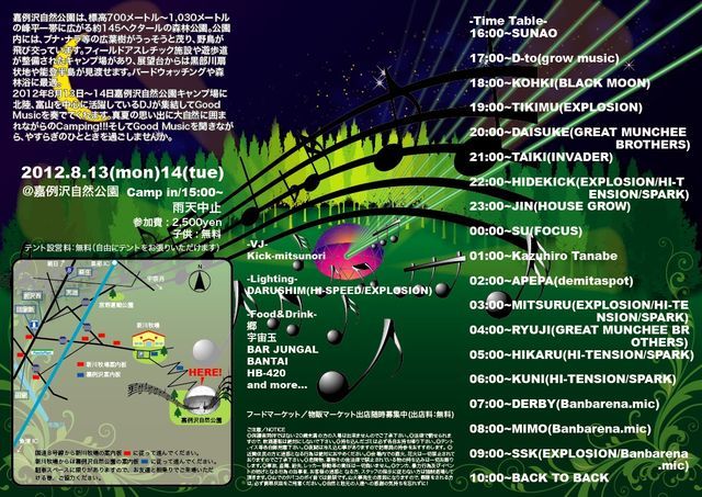 嘉例沢自然公園は、標高700メートル〜1,030メートルの峰平一帯に広がる約145ヘクタールの森林公園。公園内には、ブナ・ナラ等の広葉樹がうっそうと茂り、野鳥が飛び交っています。フィールドアスレチック施設や遊歩道が整備されたキャンプ場があり、展望台からは黒部川扇状地や能登半島が見渡せます。バードウォッチングや森林浴に最適。 2012年8月13日〜14日嘉例沢自然公園キャンプ場 に北陸、富山を中心に活躍しているDJが集結してGood Musicを奏でてくれます。真夏の思い出に大自然に囲まれながらのCanping!!!そしてGood Musicを聞きな